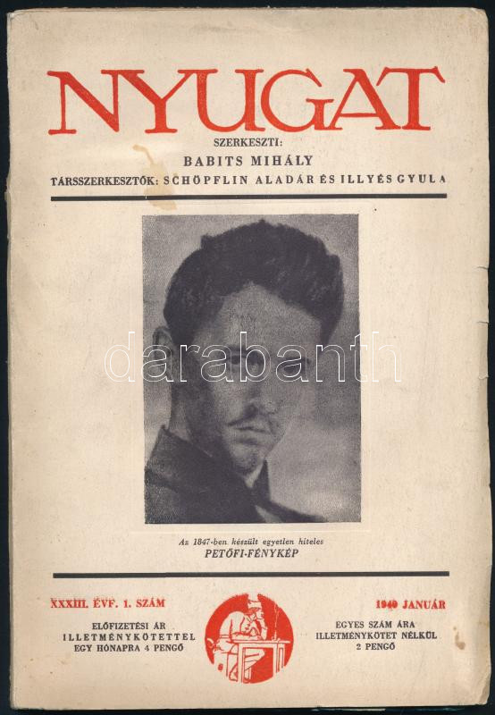 1949 Nyugat XXXIII. évfolyam 1. száma, szerk.: Babits Mihály, címlapon... https://www.darabanth.com/hu/436-Gyorsarveres/436.0/Mutargy-papirregiseg-egyeb/Nyomtatvanyok~1000003/1949-Nyugat-XXXIII-evfolyam-1-szama-szerk-Babits-Mihaly-cimlapon-Petofi-arckepevel-74p~II2828811