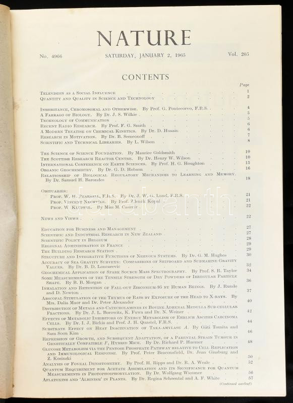 Leírás: 1965 Nature c. tudományos folyóirat egybekötött számai, Vol. 205, 1965. jan. 2. - febr. 27. Fekete-fehér képekkel illusztrálva, angol nyelven. Félvászon-kötésben.