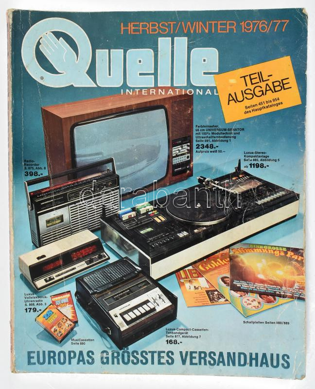 1976 Quelle International, Herbst/Winter 1976/77., német nyelvű, képes katalógus (órák, ékszerek, lakberendezés, játékok, stb.), kissé viseltes borítóval