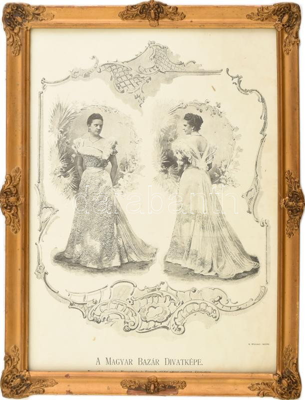 cca 1900 A Magyar bazár divatképe, Monaszterly és Kuzmik utódai udvari szállítók, Váczi utca. Nyomat, papír. Dekoratív, üvegezett fakeretben. 32×23,5 cm