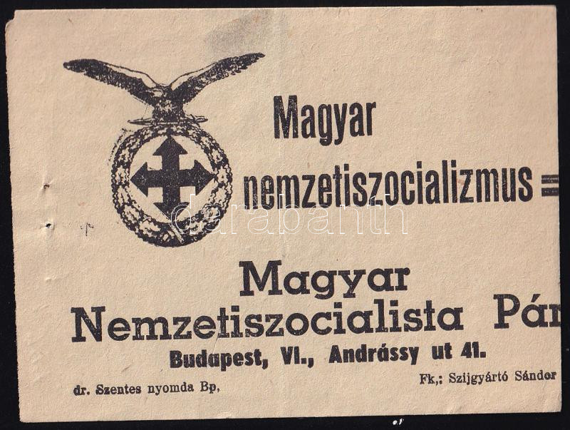 cca 1940 "Magyar nemzetiszocializmus = Magyar Nemzetiszocialista ... https://www.darabanth.com/hu/436-Gyorsarveres/436.0/Mutargy-papirregiseg-egyeb/Nyomtatvanyok~1000003/cca-1940-Magyar-nemzetiszocializmus-3D-Magyar-Nemzetiszocialista-Part-roplap-10x7-5-cm-hatoldalC3~II2819375