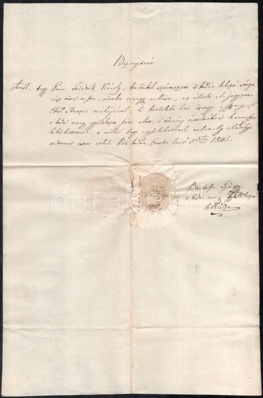 Leírás: 1825 Buda, Bauhofer György (1806-1864) evangélikus lelkész, újságíró által kiállított házassági engedély, pecséttel.