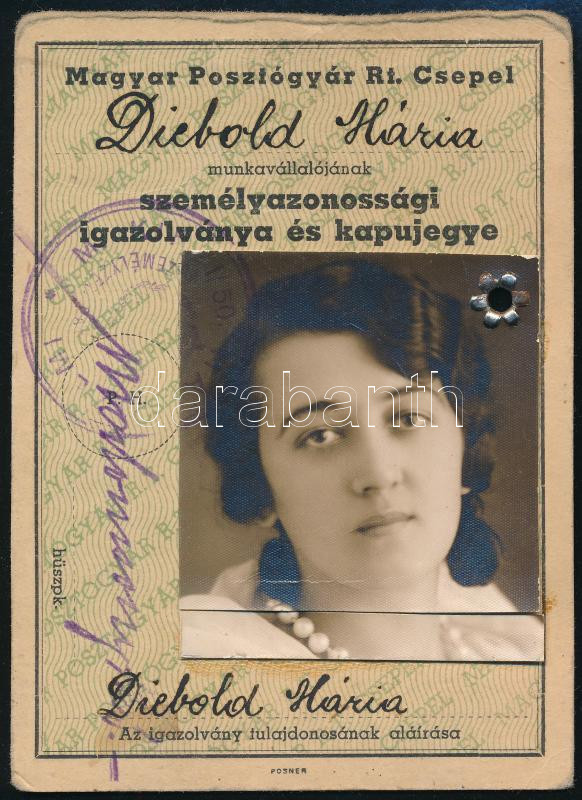 1942 Magyar Posztógyár Rt. Csepel, fényképes személyazonossági igazolv... https://www.darabanth.com/hu/436-Gyorsarveres/436.0/Mutargy-papirregiseg-egyeb/Okmanyok~500018/1942-Magyar-Posztogyar-Rt-Csepel-fenykepes-szemelyazonossagi-igazolvany-es-kapujegy-~II2834857
