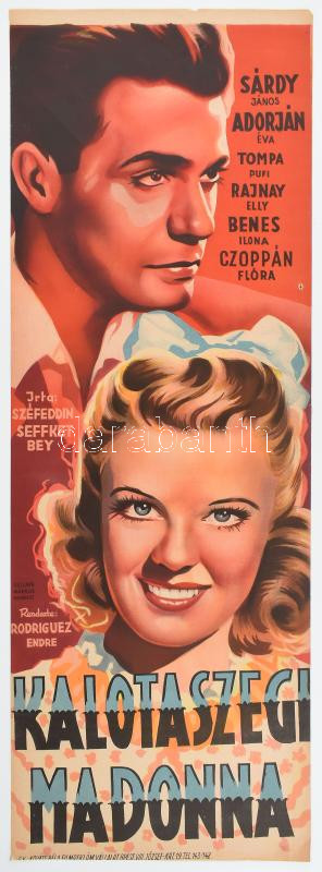 Kalotaszegi Madonna, 1943. Moziplakát (filmplakát, rácsplakát). Sárdy János, Adorján Éva, Tompa Pufi, Rajnay Elly, Benes Ilona, Czuppán Flóra szereplésével. Litográfia, papÃr. Kellner Márkus Nyomda, Bp. Lap tetején apró sérüléssel, máskülönben jó állapotban. 84×29 cm. / Vintage Hungarian poster of a movie, with very small damage on the top, otherwise in good condition, lithograph on paper.