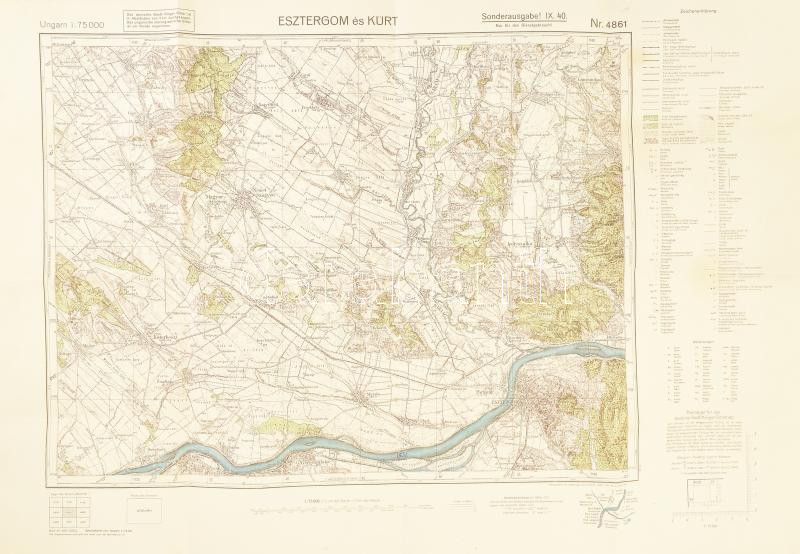 Leírás: 1940 Esztergom és Kürt, II. világháborús német katonai térkép, 1 : 75.000, magyar és német nyelvű jelmagyarázattal, 74x49,5 cm