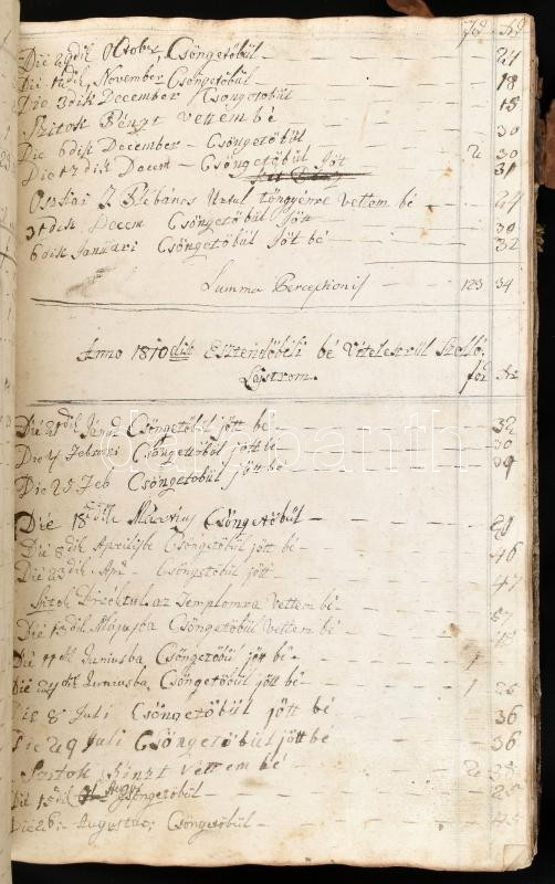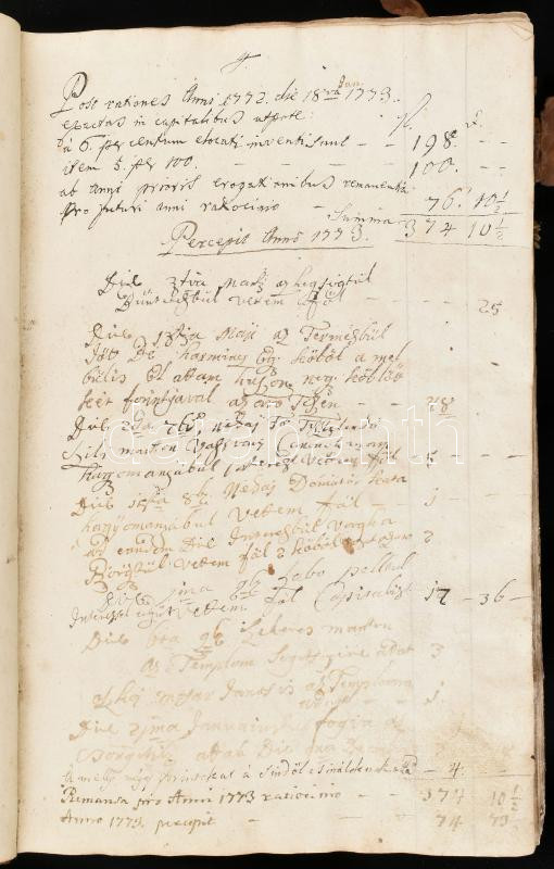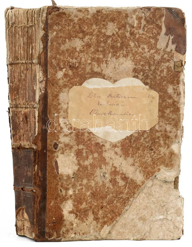 1773-1910 Oloszkai templom (Vas megye) könyve, benne bevételekkel, kiadásokkal, latin és német nyelven. Korabeli félbőr-kötésben, kopott borítóval, sérült, nagyrészt hiányos gerinccel, foltos lapokkal, sérült elülső kötéstáblával.