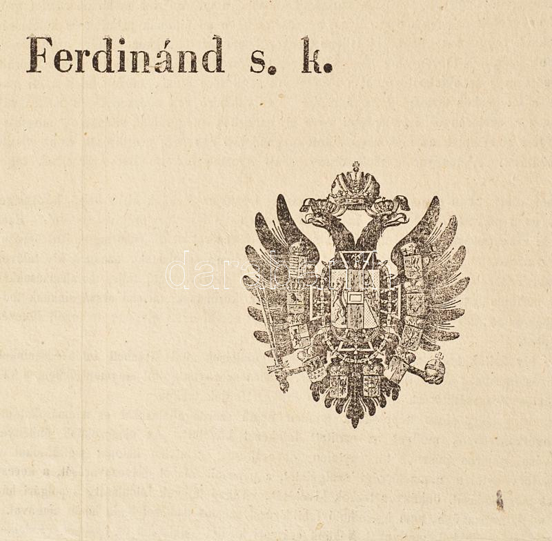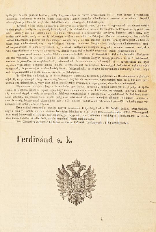Leírás: 1848 november 6. V. Ferdinánd Olmützi kiáltványa Windischgraetz tábornok kinevezéséről a rend helyreállítására-. Foltos. 25x41 cm