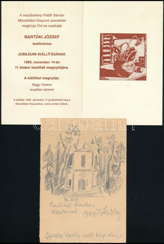Leírás: 1999 Bartóki József (1929-2009) festőművész kiállításának meghívója + grafika (Gyulai kórház volt kápolnája. Ceruza, papír, jelzett, autográf ajándékozási sorokkal, 15x10,5 cm), eredeti borítékkal