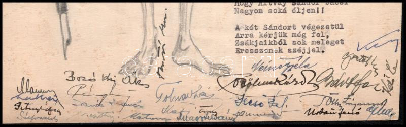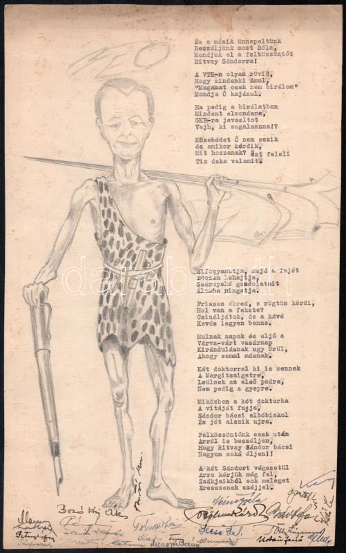 cca 1946 Ritvay Sándor miniszteri tanácsos (Építésügyi Minisztérium) köszöntése kollégái által, gépelt vers, ceruzarajzzal, sok aláírással. Kissé foltos lap, 35,5x22 cm