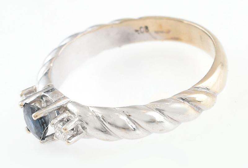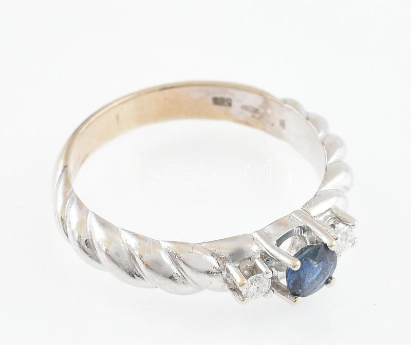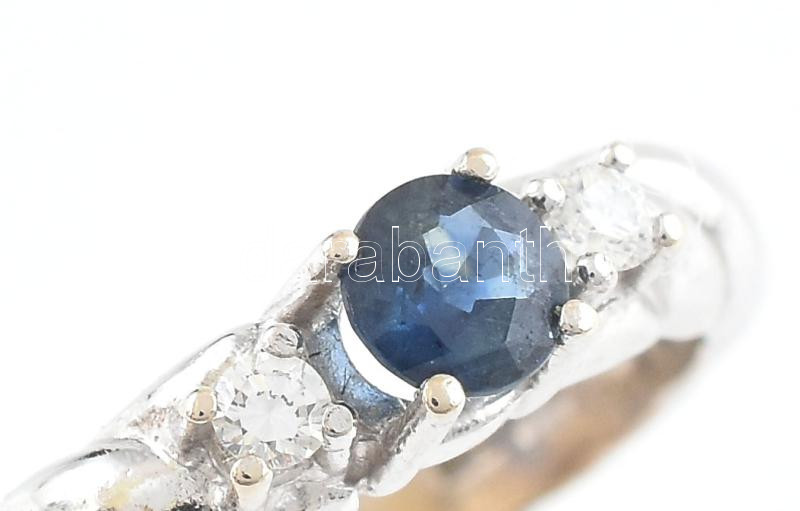 Leírás: Arany (Au/14k) fehérarany gyűrű zafírral és briliánsokkal ékített, m: 55, bruttó: 3,8g