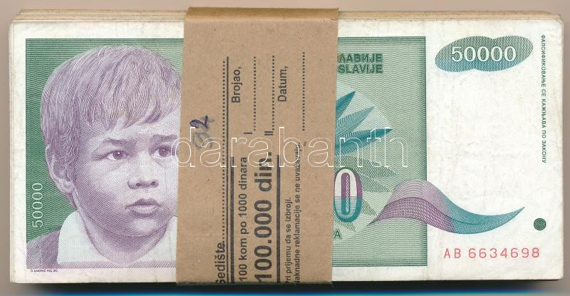 Yu... https://www.darabanth.com/hu/436-Gyorsarveres/436.0/Numizmatika/Kulfoldi-bankjegyek~2500001/Jugoszlavia-1992-50000D-92x-nem-eredeti-kotegelovel-TIII-III--Yugoslavia-1992-50000-Dinar~II2829511