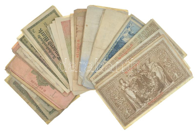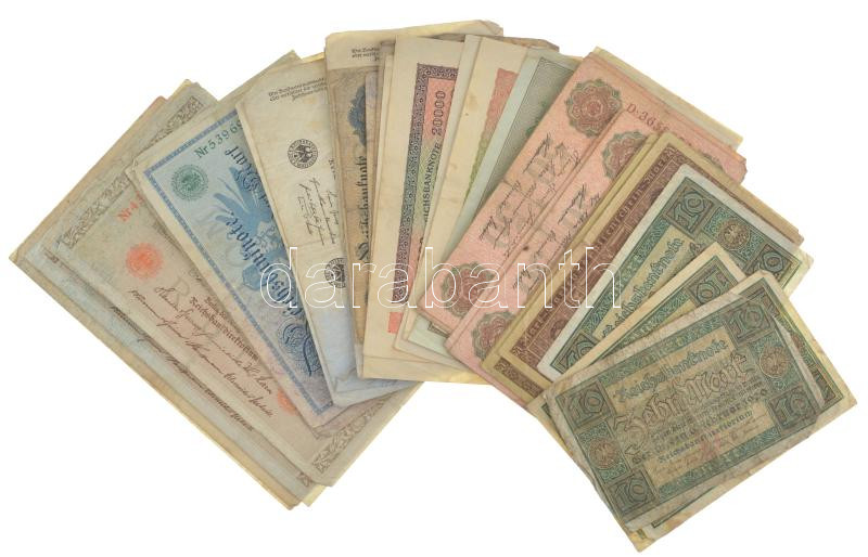Németország ~1910-1920. 50 darabos vegyes német bankjegy tétel (10xklf) T:III,III- közte tűlyuk, folt, szenny., szakadás, lyuk, saroktörés Germany ~1910-1920. 50 pieces mixed german banknote lot (10xdiff) C:F,VG include needle hole, spotted, dirty, torn, hole, folded corner