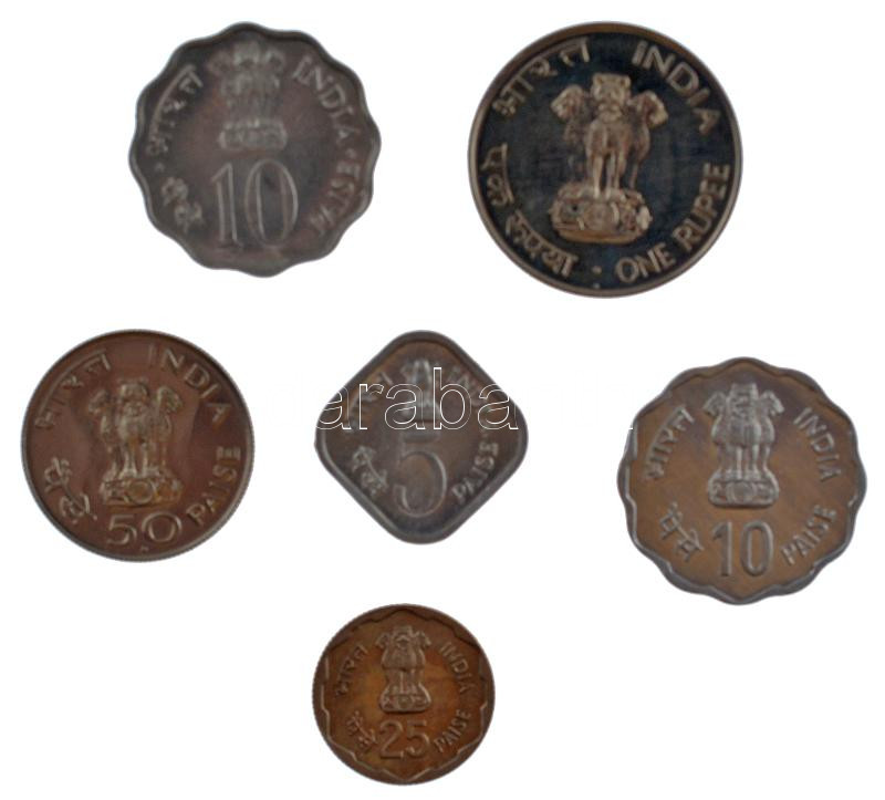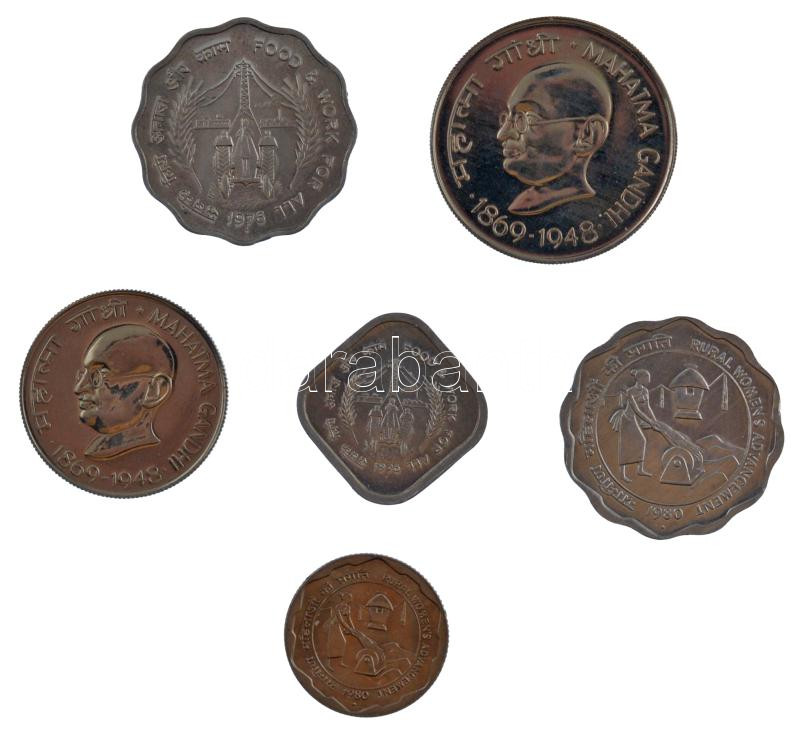 Leírás: India 1976. 5p Al "FAO" + 10p Al "FAO" + 1980. 10p Al "Vidéki nők haladása" + 1980. 25p Cu-Ni "Vidéki nők haladása" + 1969. 50p Ni "Mahatma Gandhi" + 1969. 1R Ni "Mahatma Gandhi" T:1,1-