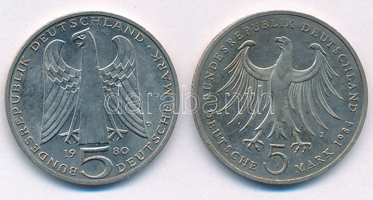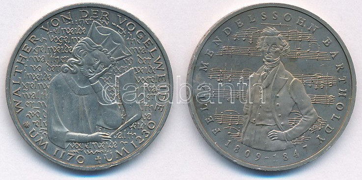 Leírás: NSZK 1980D 5M Cu-Ni "von der Vogelweide halálának 750. évfordulója + NSZK 1984J 5M Cu-Ni "Felix Bartholdy születésének 175. évfordulója" T:1- patina FRG 1980D 5 Mark Cu-Ni "750th Anniversary - Death of von der Vogelweide" + 1984J 5 Mark Cu-Ni "175th Anniversary - Birth of Felix Bartholdy" C:AU patina Krause KM#152, KM#161