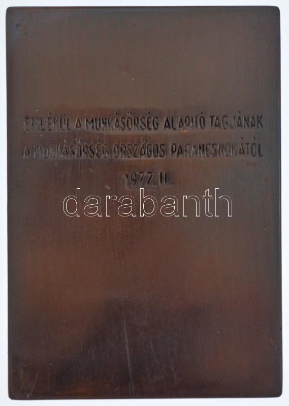 Kiss Nagy András (1930-1997) 1977. "De elvtársaim! Ez az a munkásság, mely osztályharcban vasba öltözött... / Emlékül a Munkásőrség alapító tagjának a Munkásőrség országos parancsnokától 1977. II." vörösréz emlékplakett (104,5x72mm) T:1-