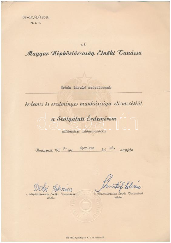 Leírás: 1959. "Szolgálati Érdemérem" névre szóló adományozói okirata "Magyar Népköztársaság Elnöki Tanácsa" szárazpecséttel T:2 kis szakadás