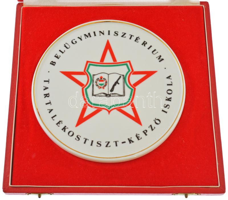Leírás: ~1970. "Belügyminisztérium Tartalékos Tiszt-képző Iskola" jelzett hollóházi porcelán emlékérem eredeti dísztokban (140mm) T:1-