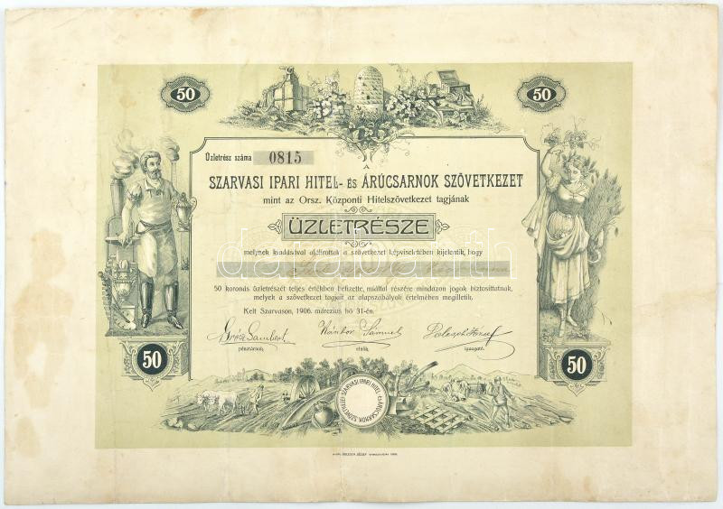 Leírás: Szarvas 1906. "Szarvasi Ipari Hitel- és Árucsarnok Szövetkezet" üzletrésze 50K értékben, szelvényekkel T:III fo., restaurált