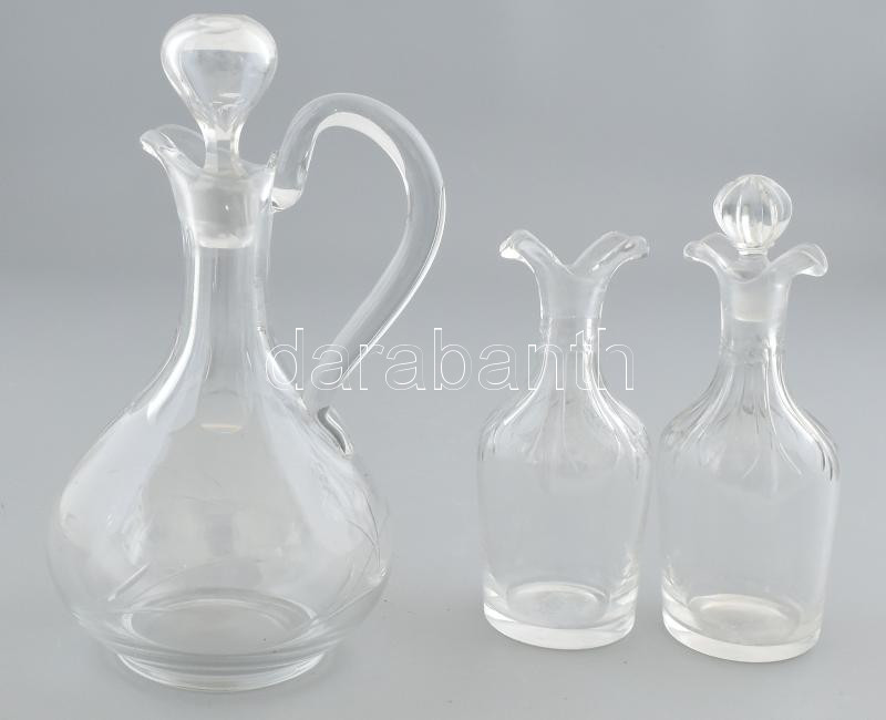 Leírás: 3 db metszett üveg kiöntő, kettő dugóval, a dugókon kis csorba, m: 17-25 cm