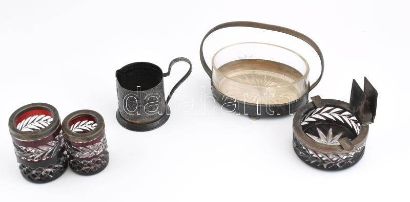 Leírás: 4 db kristály és csiszolt üvegbetétes asztali kínáló d: 11 cm, 16x17 cm + fém teás pohár tartó