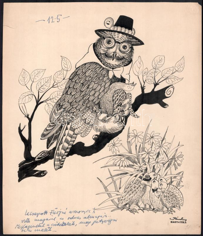 Róna Emy (1904-1988): Illusztráció Szondy György Szép csöndes nyári éjtszaka c. meséjéhez. Tus, papír, hagyatéki pecséttel jelzett, lapszéli kisebb szakadással, 34×29,5 cm.