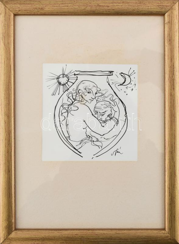 Szász Endre (1926-2003) Ezeregyéjszaka meséi. sorozat egy része. Tus, papír, szép üvegezett fakeretben, hátoldalon: Művészetileg ellenőrzött pecsét jelzett. 10x9 cm