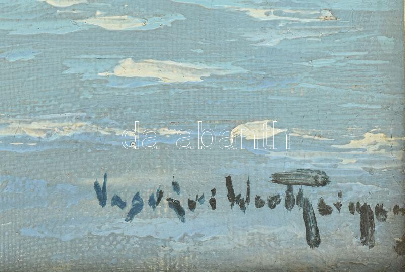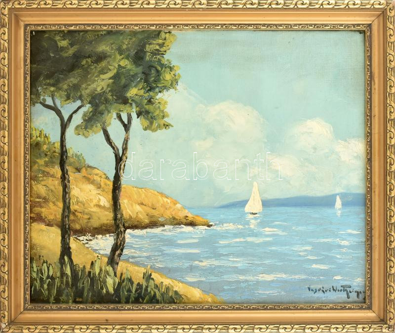 Leírás: Vasvári Wertheimer Sándor (?-?): Vitorlások. Olaj, vászon, jelzett, 40x50 cm. Dekoratív, sérült fakeretben.