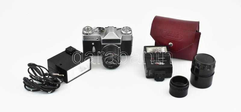 Leírás: cca 1970 Zenit-E szovjet fényképezőgép, Industar-50-2 3,5/50 objektívvel, makro gyűrűvel, hozzá telekonverter + SL 3 nem kipróbált vaku