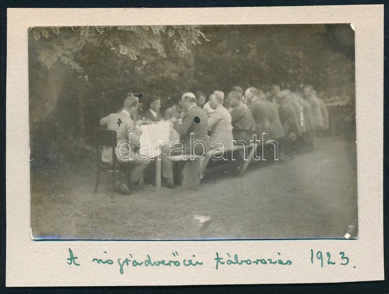Leírás: 1924 Csurgó, ebéd, Albrecht főherceg, Károlyi József gróf, Khuen-Héderváry Károly, hátoldalon feliratozott fotó, 6×9 cm
