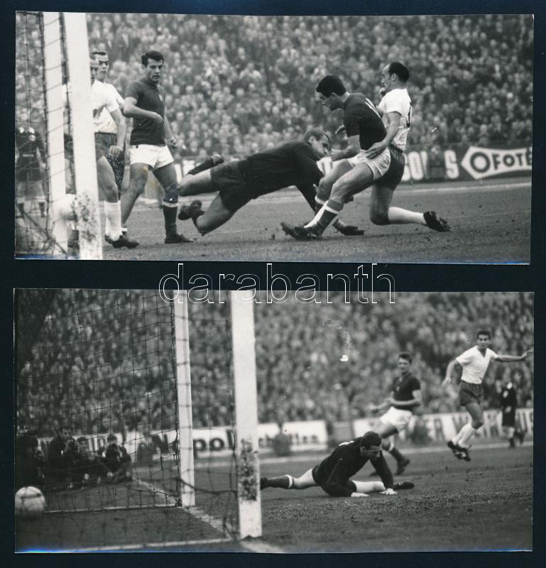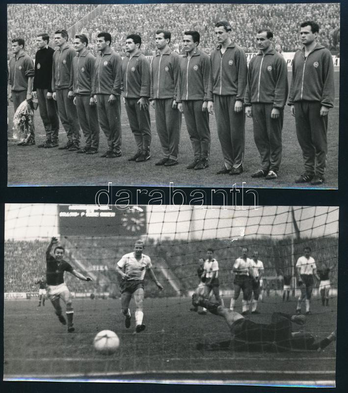 1965 A magyar labdarúgó-válogatott játékosai (köztük Albert Flórián) a mérkőzés előtti felsorakozásnál és meccs közben, 4 db sajtófotó, a hátoldalon feliratozottak, pecséttel jelzettek, 18x10 cm körül