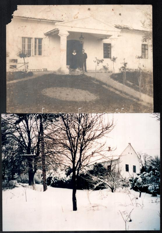 3 db fotó Szentkirályi István & Bogyay Stefánia bocsotai (Zalahosszúfalu) kastély előtt, 1930-40 körül, jelzés nélküli vintage fotó, sérült, foltos, 16x22 cm + 2 db fotó a bocsotai kastélyről, modern előhívás, 17,5x23,5 és 21,5x30 cm