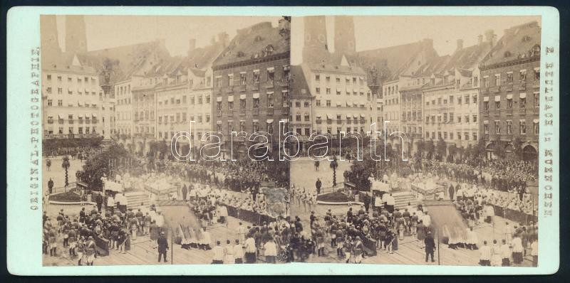 Leírás: cca 1880-1890 München, Fronleichnamsprozession (úrnapi körmenet), keményhátú sztereofotó, 8,5x17,5 cm / Munich, vintage stereo photo