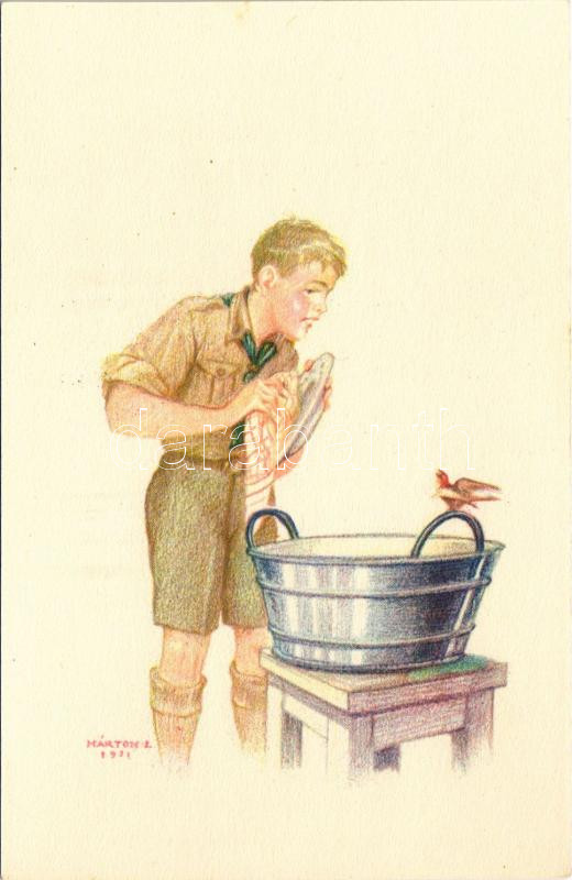 Leírás: A cserkész híven teljesíti kötelességét. A Magyar Cserkészszövetség kiadása / Hungarian boy scout art postcard s: Márton L.