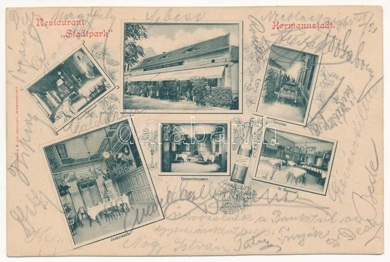 1899 (Vorläufer) Nagyszeben, Hermannstadt, Sibiu; Restauration "Stadtpark", Kleiner Speisesaal, Veranda, Frühstückzimmer, Gr. Speisesaal, Jagdzimmer / Stadtpark vendéglő, étterem, kis és nagy étkező belső, veranda, reggeliző szoba, vadászszoba. Lichtdruck v. Jos. Drotleff / restaurant, interiors, dining halls, breakfast room, hunting lounge, porch. Art Nouveau, floral (EK)