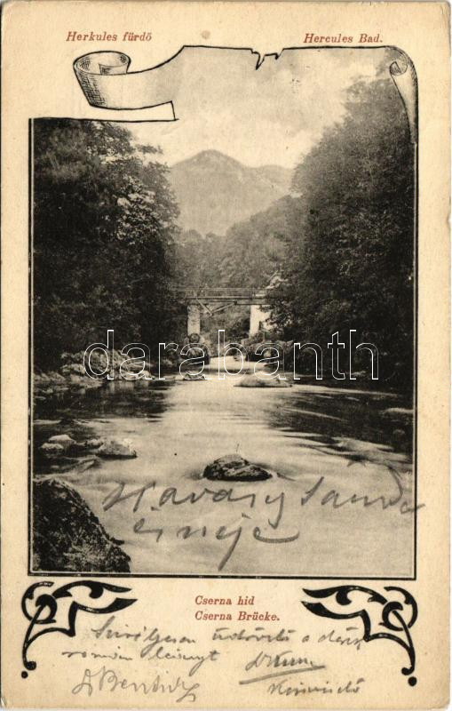 1903 Herkulesfürdő, Baile Herculane; Cserna híd. Divald Károly 911. / ... https://www.darabanth.com/hu/437-Gyorsarveres/437.0/Kepeslapok/Erdely~1500006/1903-Herkulesfurdo-Baile-Herculane-Cserna-hid-Divald-Karoly-911-Brucke-Cerna-bridge-Ar~II2852229