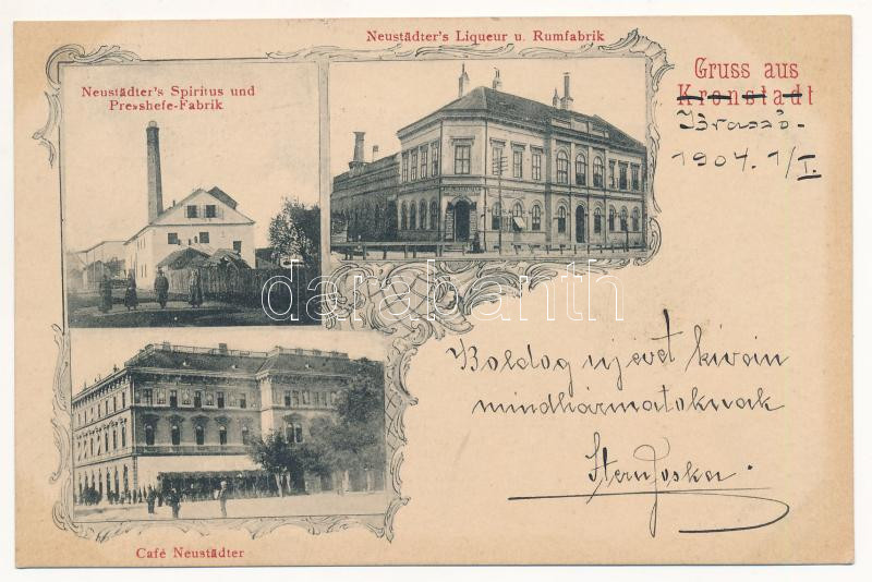1904 Brassó, Kronstadt, Brasov; Neustädter's Spiritus und Presshefe-Fabrik, Neustädter's Liqueur u. Rumfabrik, Café Neustädter / Neustädter-féle szesz- és élesztőgyár, likőr- és rumgyár, Neustädter kávéház / alcohol and yeast factory, liqueur and rum factory, café. Art Nouveau, floral