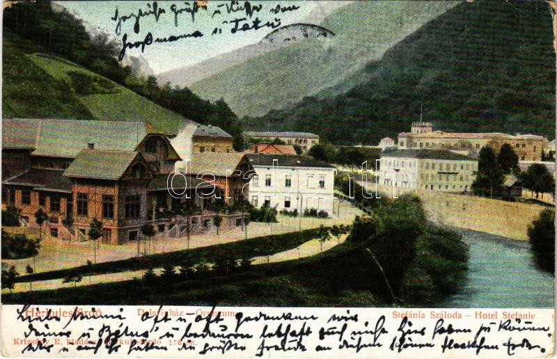 Leírás: 1904 Herkulesfürdő, Herkulesbad, Baile Herculane; Dalszínház, Stefánia szálloda. Krizsány R. kiadása / Orfeum / orpheum, hotel (kis szakadás / small tear)
