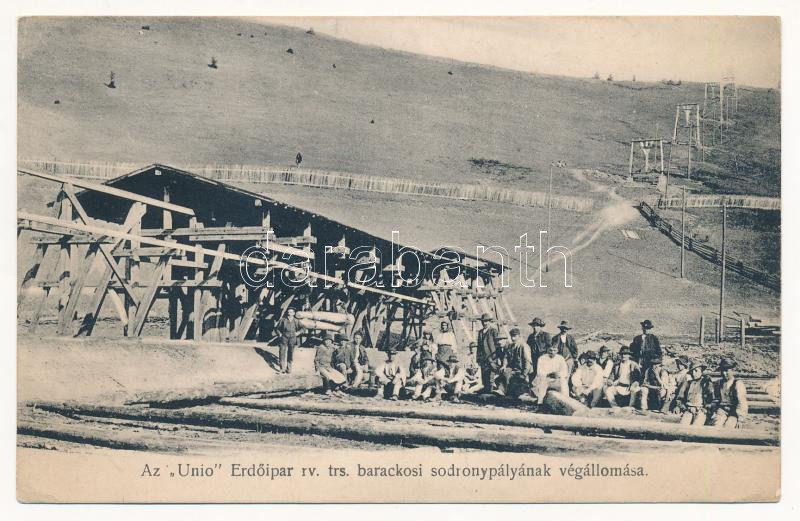 Leírás: 1908 Barackospatak, Barackospataka, Barackos, Baratcos; Az "Unio" Erdőipar rv. trs. sodronypályájának végállomása. Adler fényirda / wire rope course, ropeway transport, terminal station (EK)