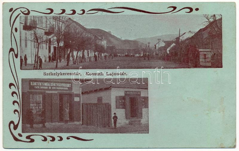 1909 Székelykeresztúr, Kristur, Cristuru Secuiesc; Kossuth Lajos tér, Szabó Kálmán könyvnyomda, könyvkötészet, papÃr, Ãrószer és könyvkereskedése és saját kiadása Özv. Katona Gyuláné üzlete / square, shops. Art Nouveau