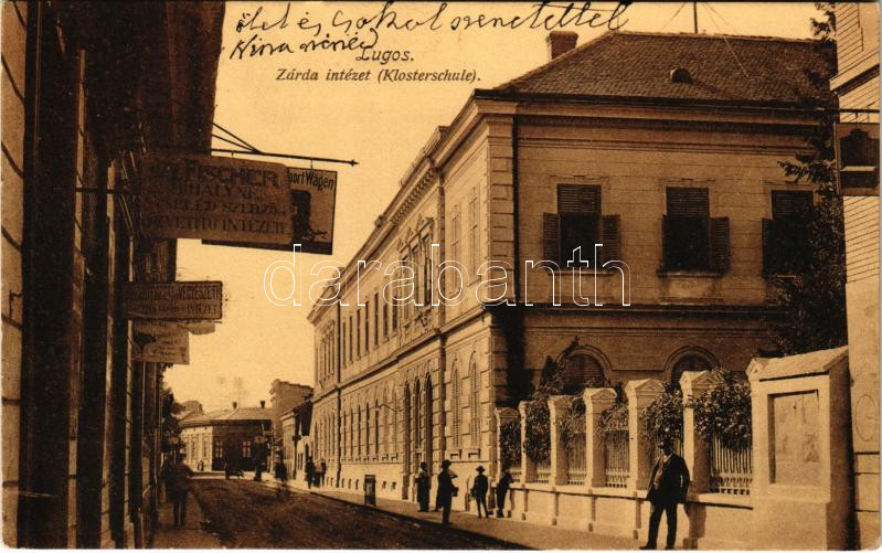 1910 Lugos, Lugoj; Zárdaintézet (Klosterschule), Özv. Fischer Mihályné... https://www.darabanth.com/hu/437-Gyorsarveres/437.0/Kepeslapok/Erdely~1500006/1910-Lugos-Lugoj-Zardaintezet-Klosterschule-Ozv-Fischer-Mihalyne-uzlete-Nemes-Kalman-~II2847055