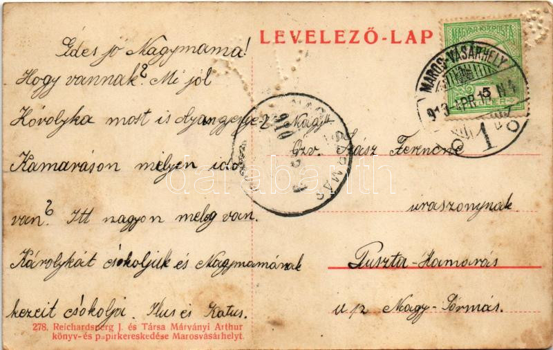 Leírás: 1910 Marosvásárhely, Targu Mures; Széchenyi tér, üzletek. Reichardsperg J. és Társa Márványi Arthur kiadása / square, shops (apró lyukak / tiny pinholes)