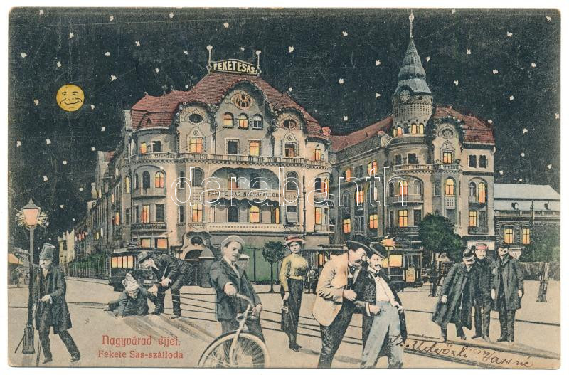 1910 Nagyvárad, Oradea; Fekete Sas szálló éjjel, villamosok. Humoros montázs részeg férfiakkal. Benkő Artur kiadása / hotel at night, trams. Humorous montage with drunk men