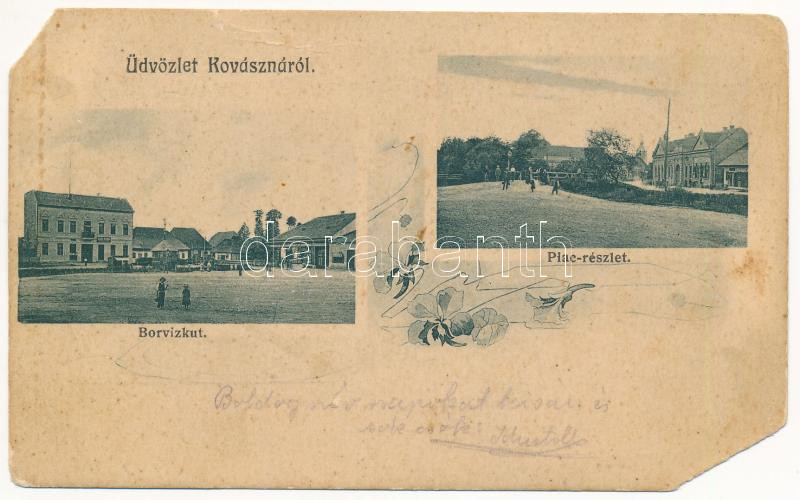 1912 Kovászna, Covasna; Borvízkút, Piac részlet, Szabó Nyomda üzlete. Bogdán F. fényképész / mineral water well, market square, book printing shop (EM)