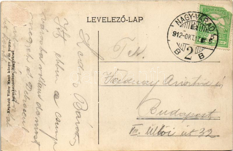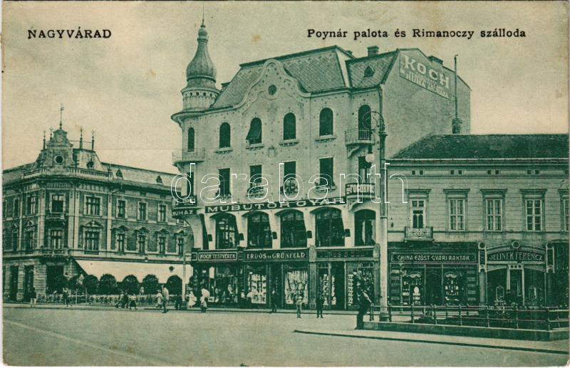 1912 Nagyvárad, Oradea; Poynár palota, Rimanóczy szálloda, Koch Testvérek ruha áruháza, Jelinek Ferenc, China ezüst gyári raktár, Műbútor gyár, fogorvos, Erdős és Grünfeld, Dr. Kovács Gyula, Dénes B. Béla üzlete. Vidor Manó kiadása / hotel, shops, doctors (Rb)