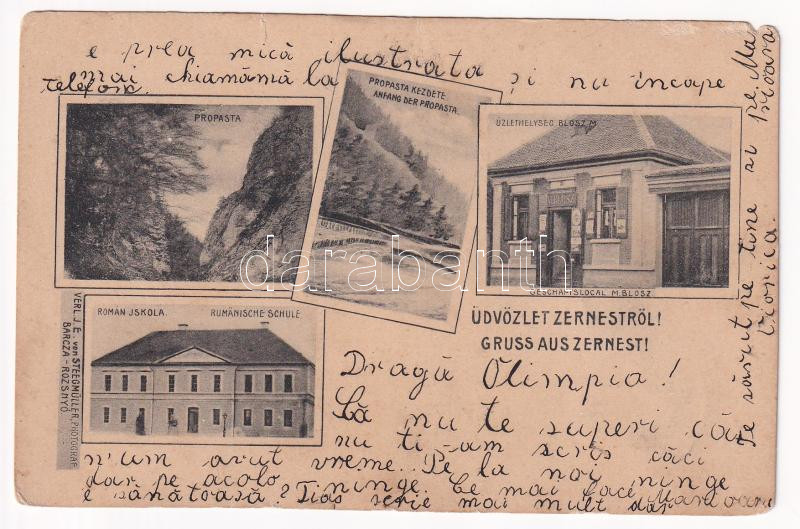 1913 Zernest, Zernyest, Zarnesti; Román iskola, Propasta és kezdete, Blosz M. üzlete. J.E. von Steegmüller / Romanian school, shop. Art Nouveau (szakadások / tears)