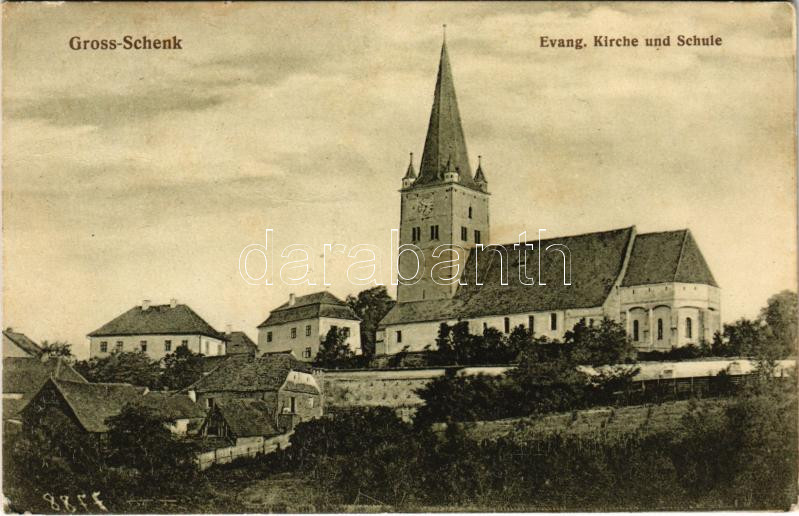 1917 Nagysink, Gross-Schenk, Cincul Mare; Evang. Kirche und Schule / Evangélikus templom és iskola. Gustav Salmen kiadása / Lutheran church and school (Rb)