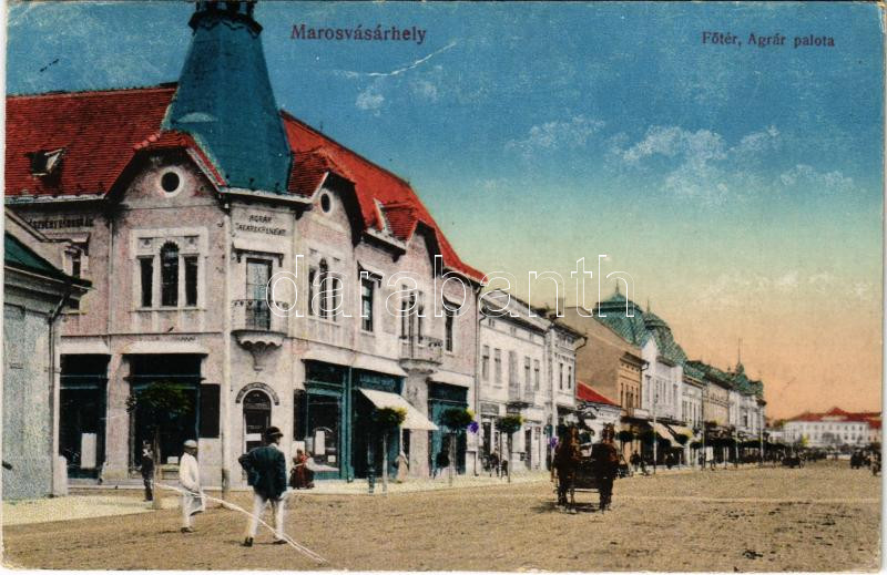 1918 Marosvásárhely, Targu Mures; Fő tér, Agrár takarékpénztár, üzletek. Vasúti levelezőlapárusítás 6. sz. 1916. / main square, savings bank, shops (EB)