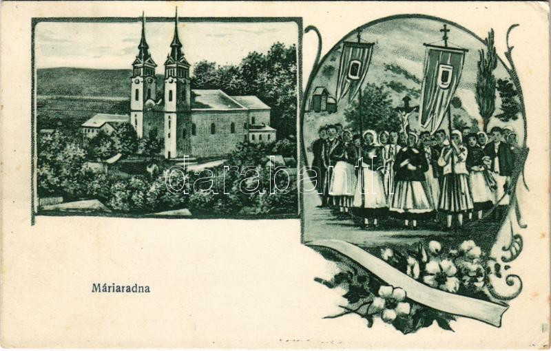 Leírás: 1919 Máriaradna, Mária-Radna, Radna (Lippa, Lipova); Kegytemplom, búcsú. Csauscher József kiadása / church, pilgrimage procession. Art Nouveau, floral (EK)