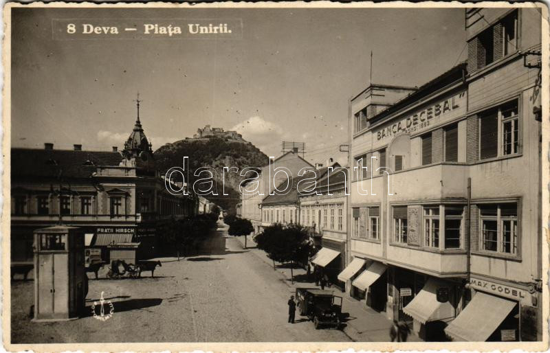 1936 Déva, Deva; Piata Unirii, Banca Decebal / Egyesülési tér, Hirsch ... https://www.darabanth.com/hu/437-Gyorsarveres/437.0/Kepeslapok/Erdely~1500006/1936-Deva-Deva-Piata-Unirii-Banca-Decebal-Egyesulesi-ter-Hirsch-Testverek-Max-Godel-uzl~II2850877