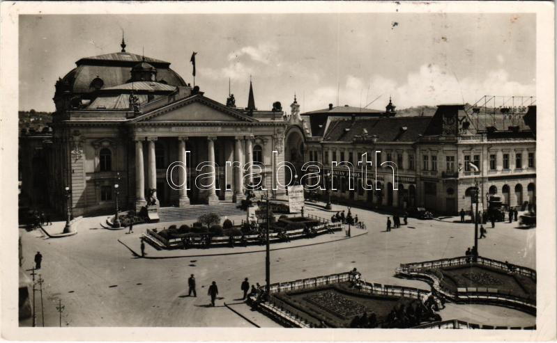 1943 Nagyvárad, Oradea; Bémer tér, Szigligeti színház, Tungsram Krypton, Ady harisnya, Magyar Általános Hitelbank, Tarr László úri fodrászat, Fazekas úri szabó, Szántay János kalap üzeme, címfestő / square, theatre, shops (ragasztónyom / gluemark)